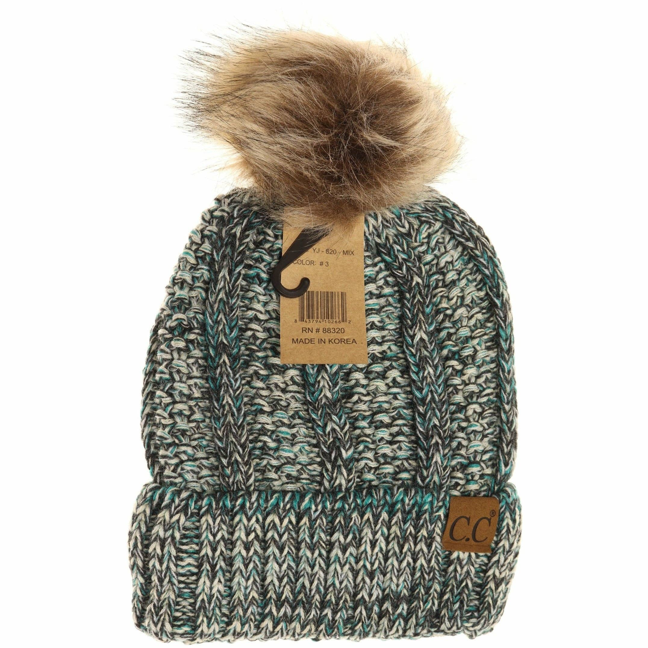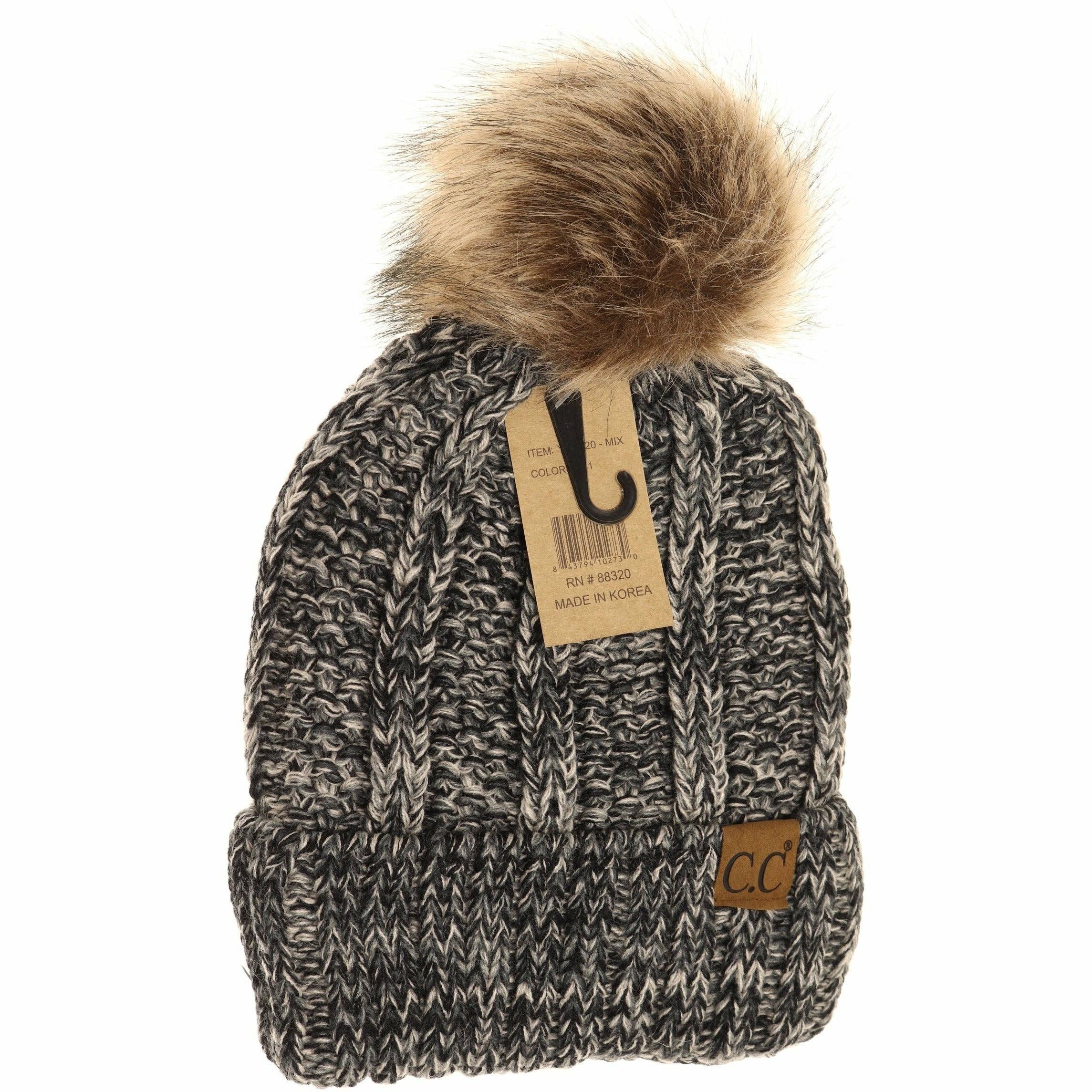 Fuzzy Lined Multi Tone Fur Pom CC Beanie