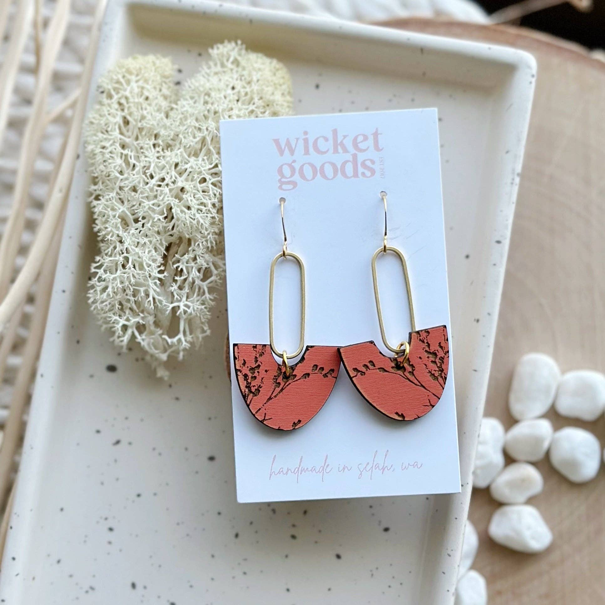 - Made from hand painted basswood, raw brass, and hypoallergenic gold plated brass ear wires.