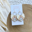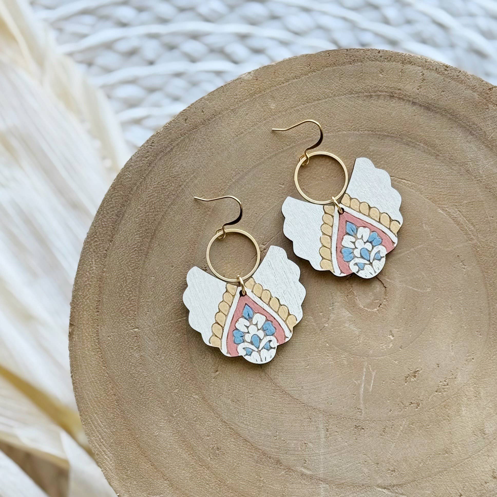 - Made from hand painted basswood, raw brass, and hypoallergenic gold-plated brass ear wires.