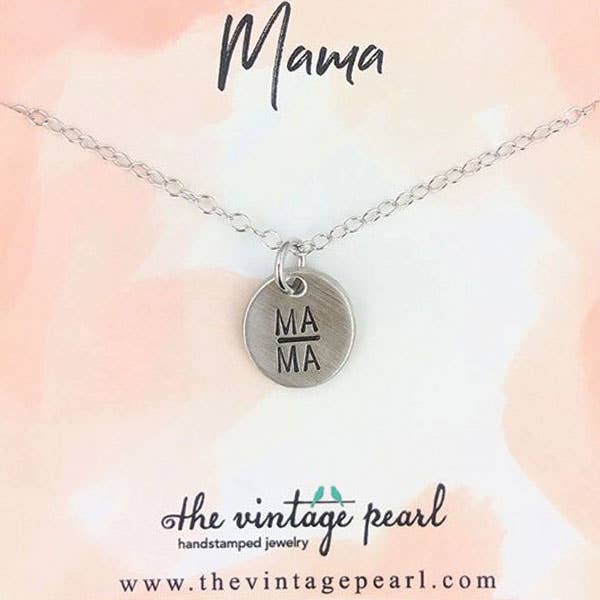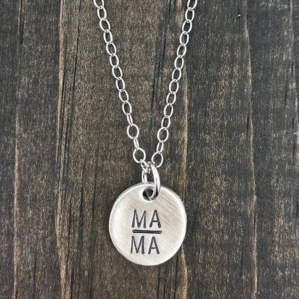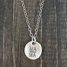 A small disc created in fine pewter stamped with "MAMA" hung on an 18in plated link chain.