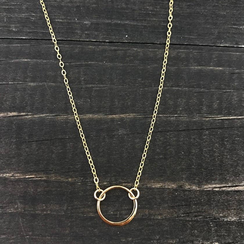 A small dainty circle created in gold-plated hung on an 18in gold-filled dainty chain.