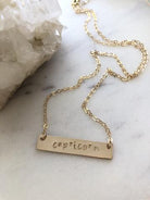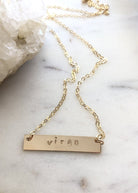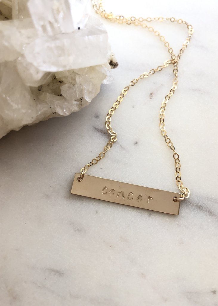 Gold bar hand stamped with your choice of zodiac sign. All 14k gold filled materials. Total chain length 18", pendant is 1.25" across.