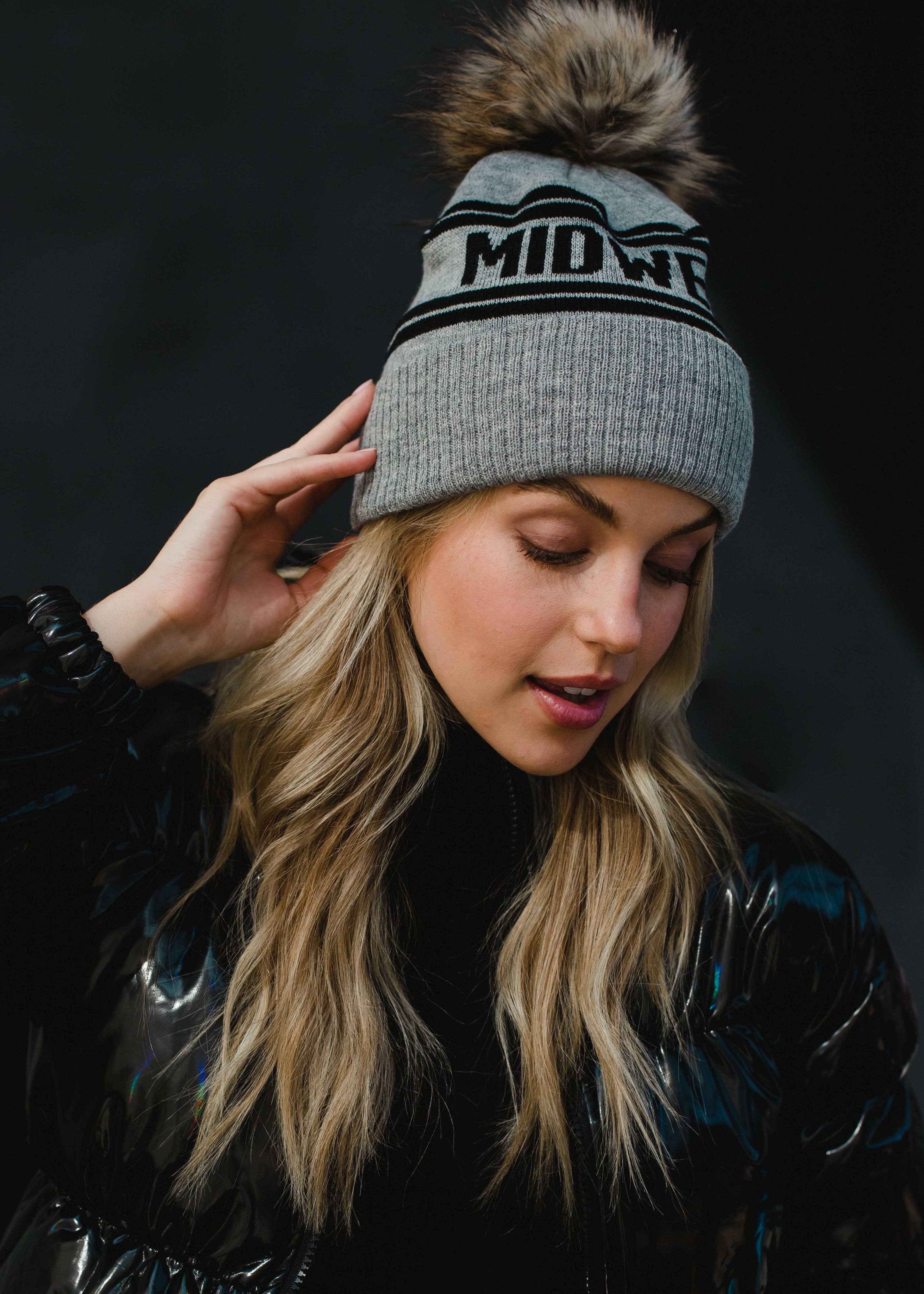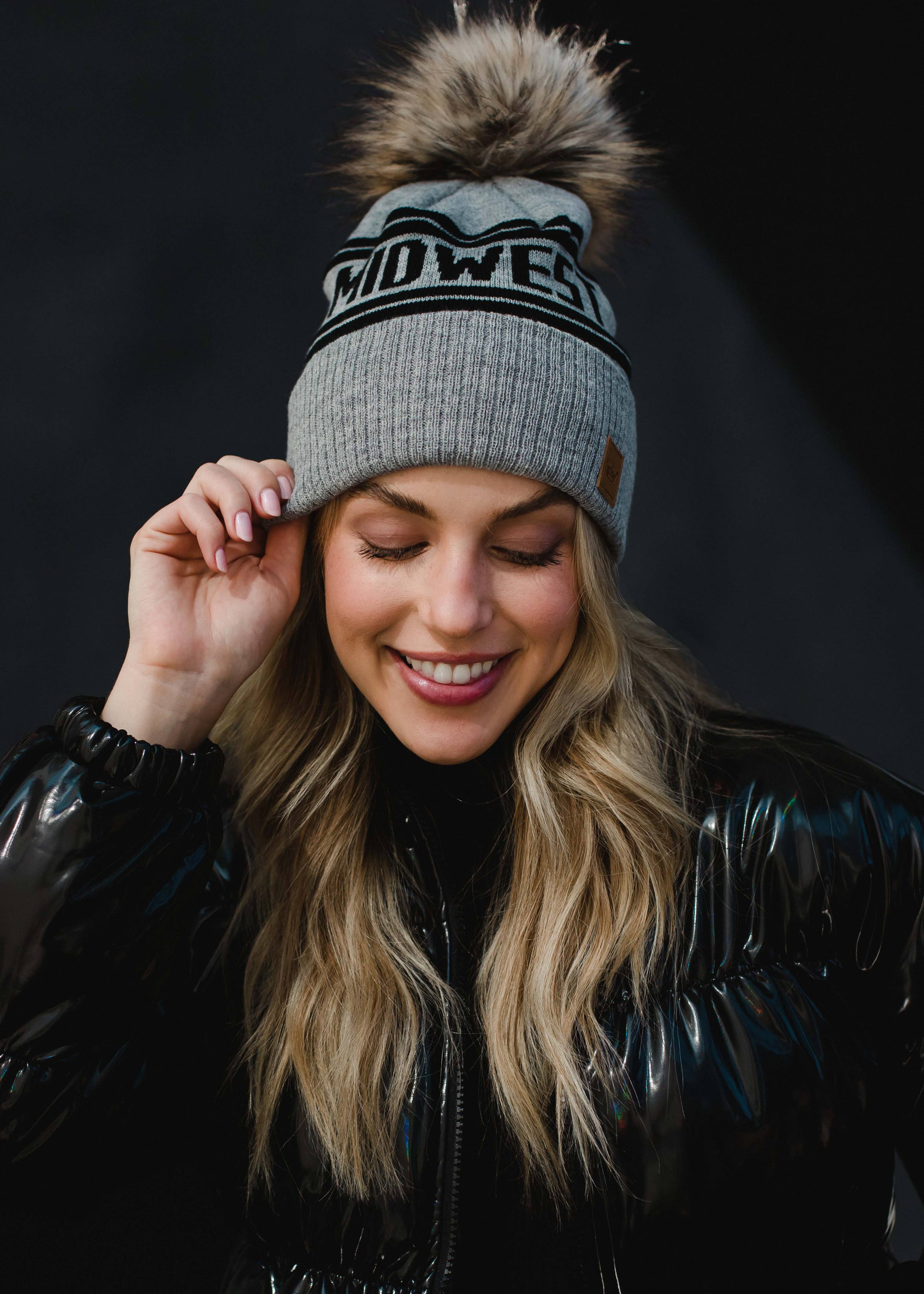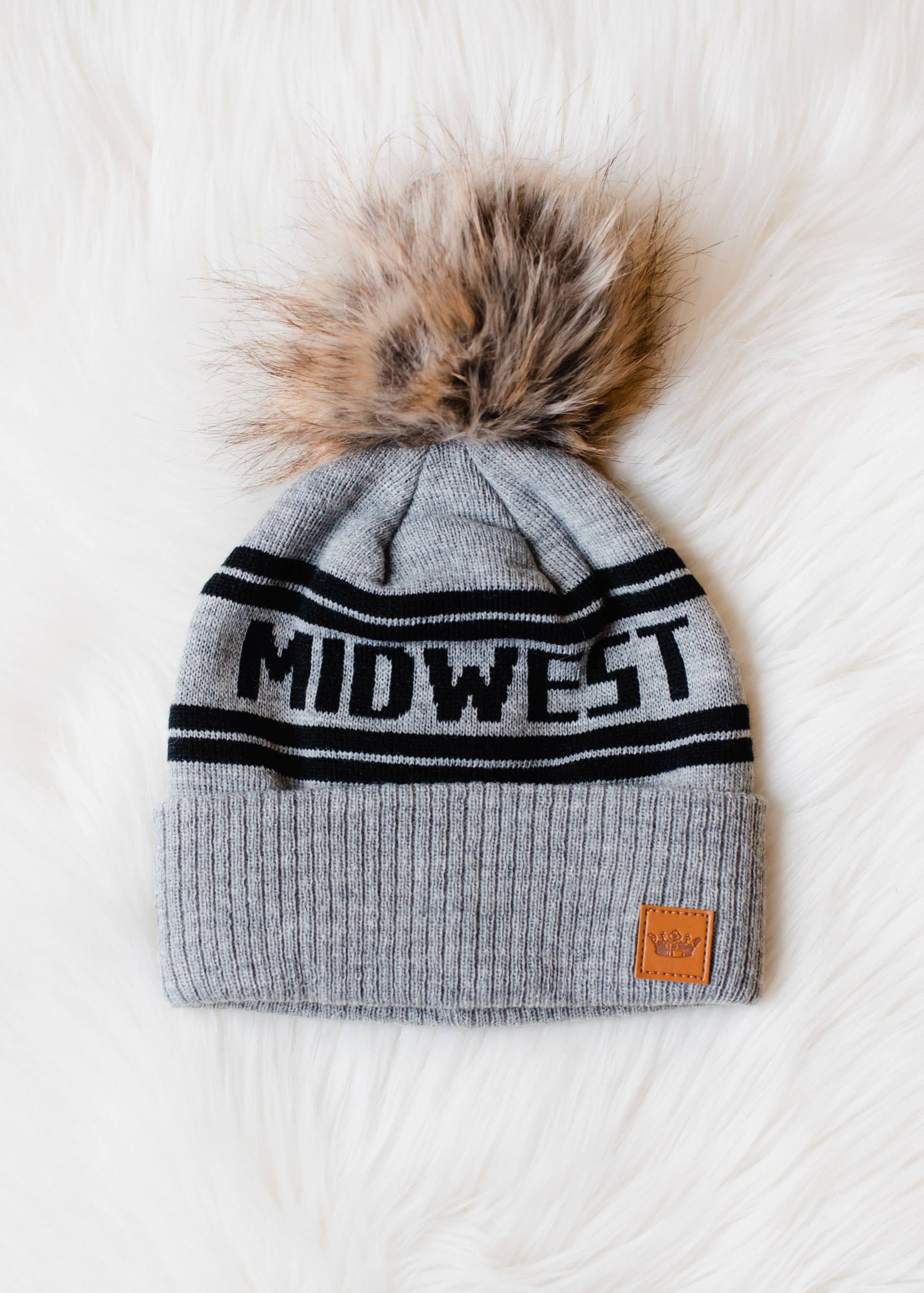 Gray & black Midwest knit hat. Natural faux fur pom accent.