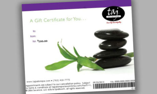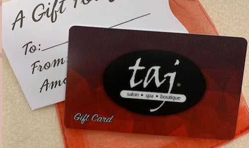 A taj salon & spa Gift Card is the perfect way to give someone a gift they'll remember for a long time. Our gift cards can be loaded for any amount you choose! Our gift cards can be used on services, products, or boutique purchases. They cannot be used for gratuity.